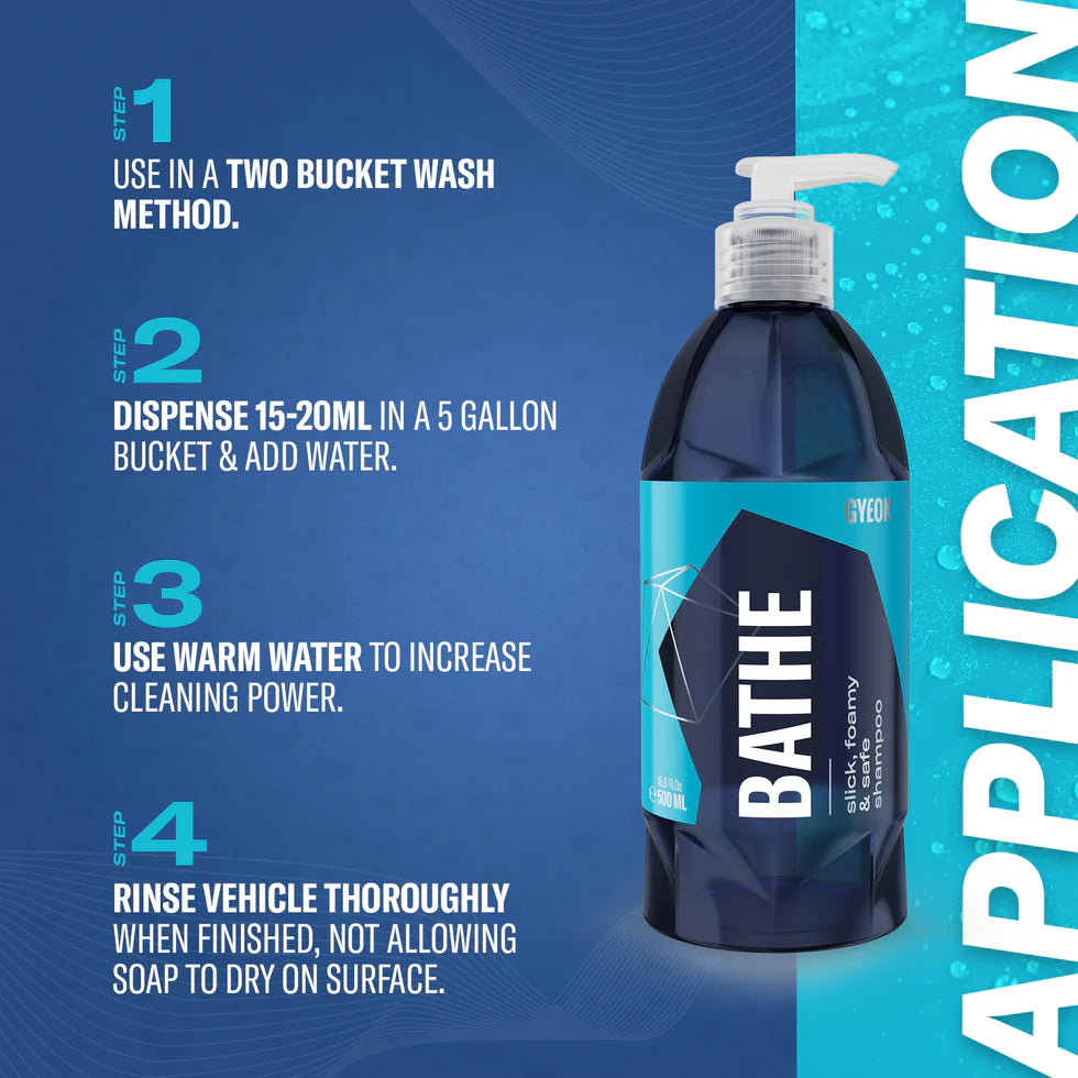 Gyeon Q²M Bathe es muy eficaz gracias a su fórmula altamente concentrada. El gel espeso es naturalmente soluble en agua, emite un olor muy agradable, que recuerda a Q²M Cure, además de producir una espuma de larga duración.